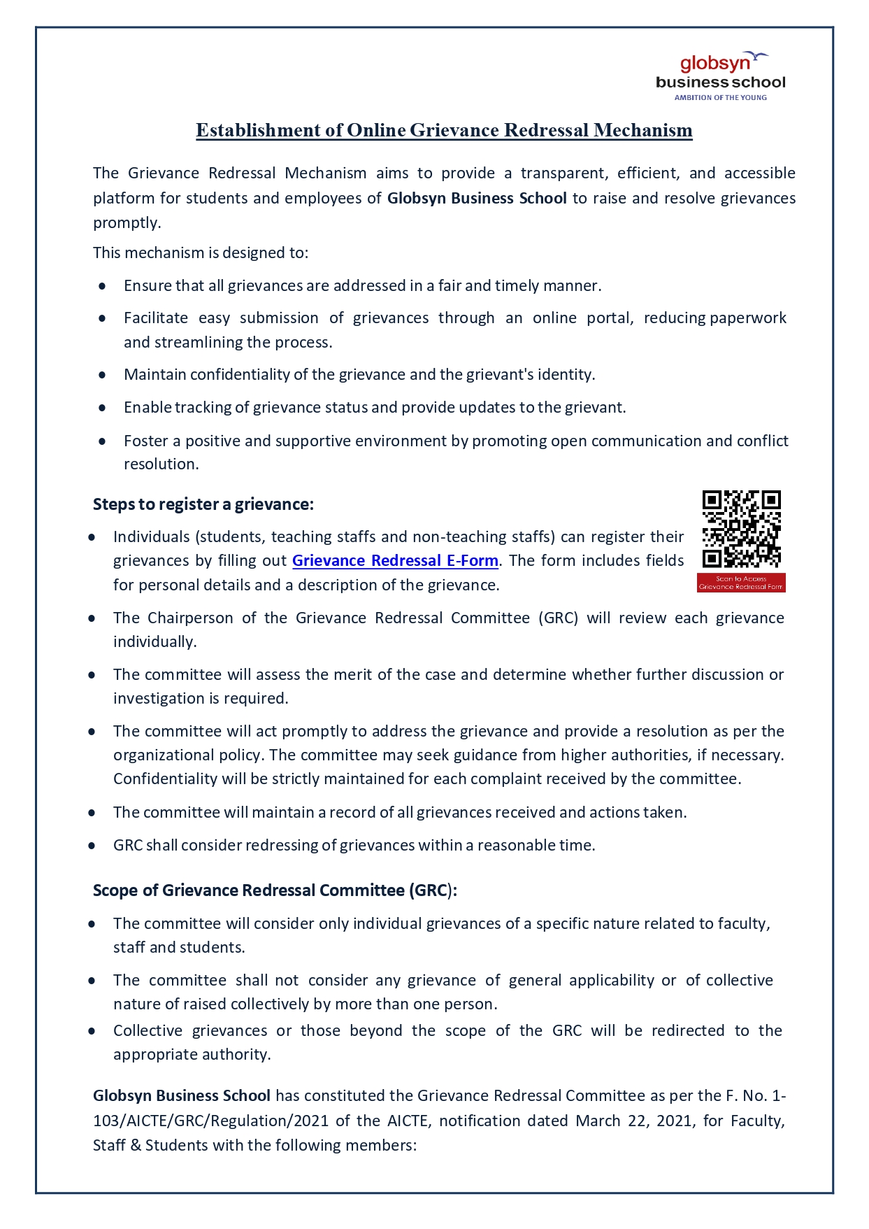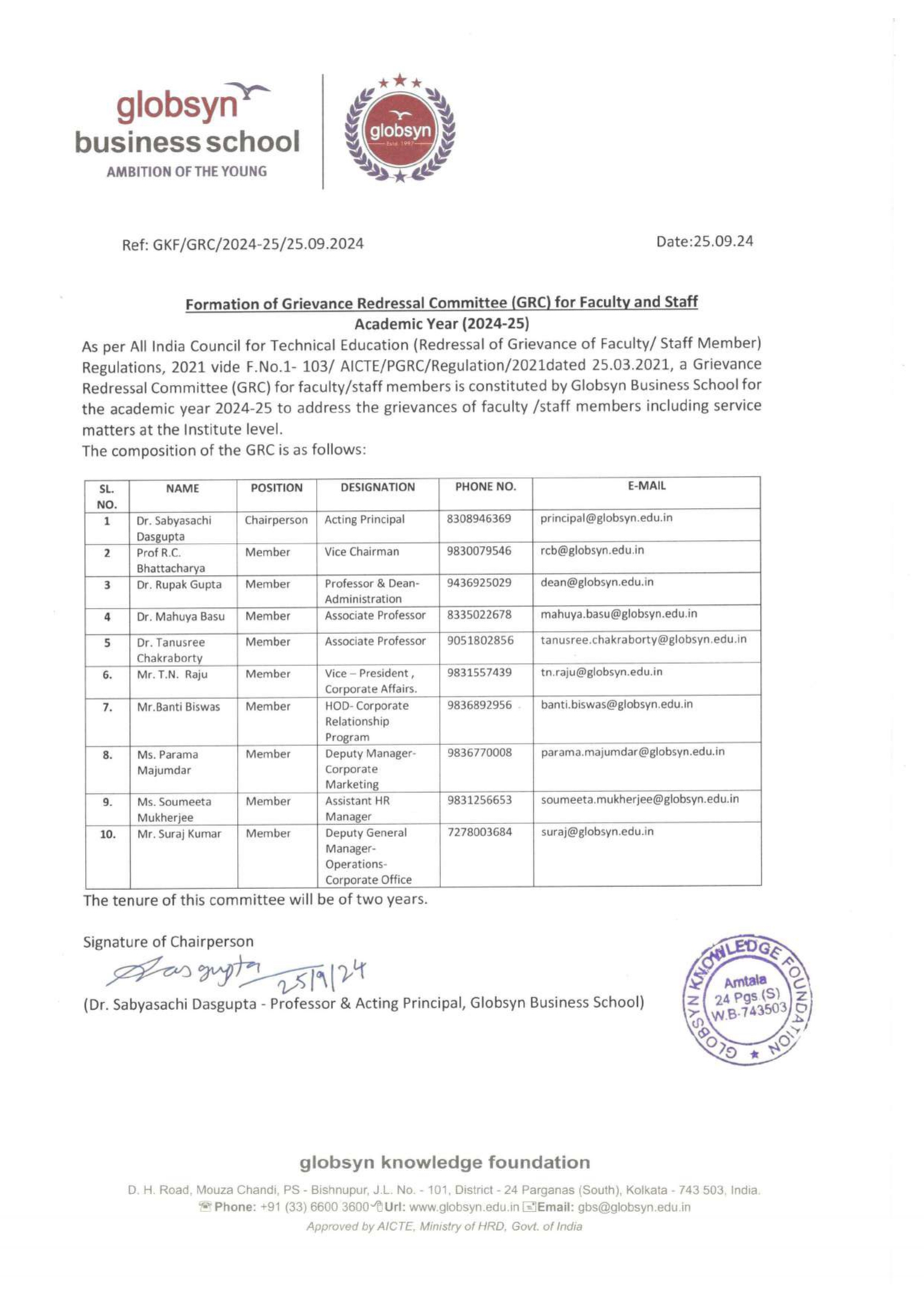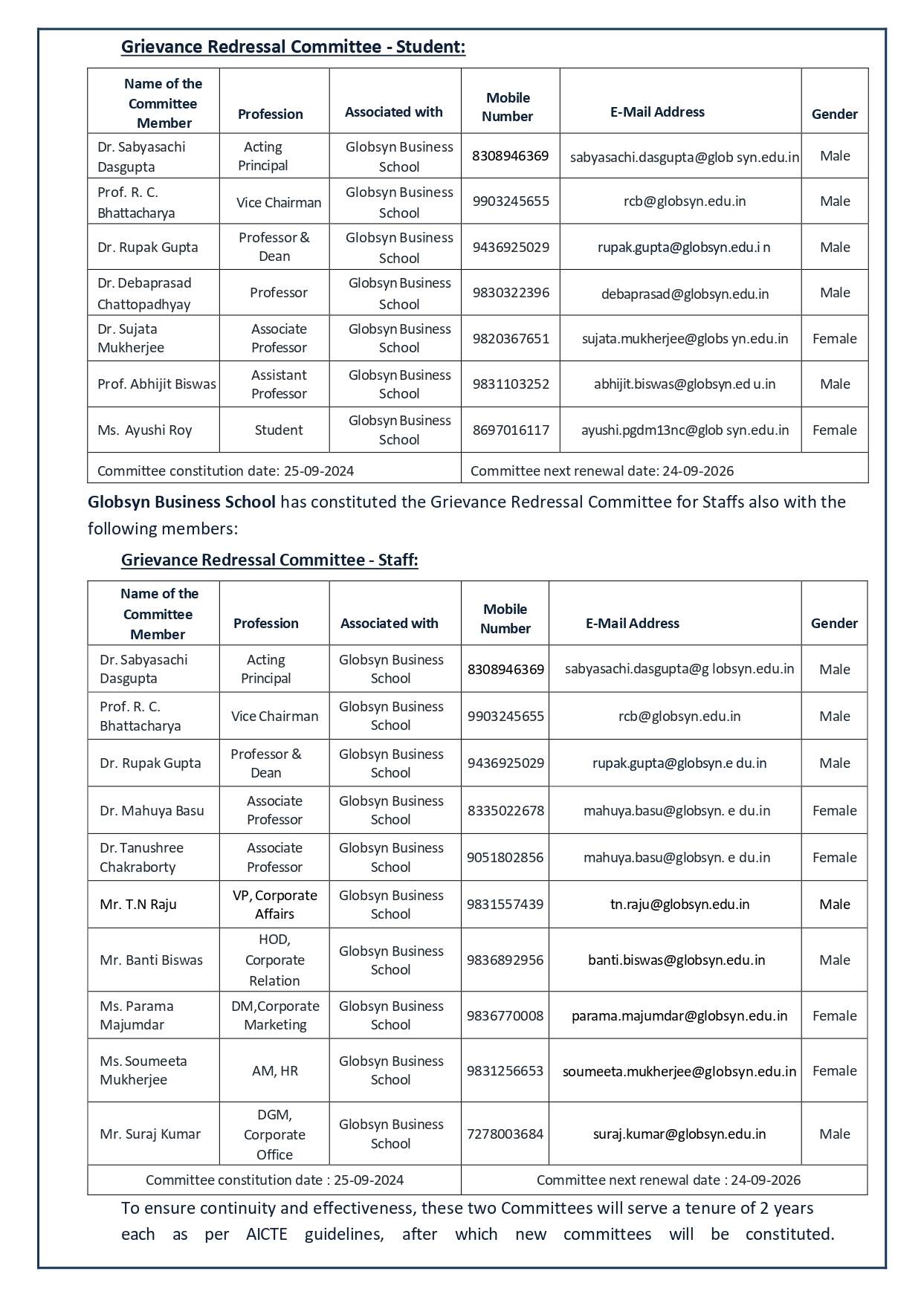 To know more about Globsyn Business School’s Grievance Redressal Committee for Faculty and Staff, visit here.