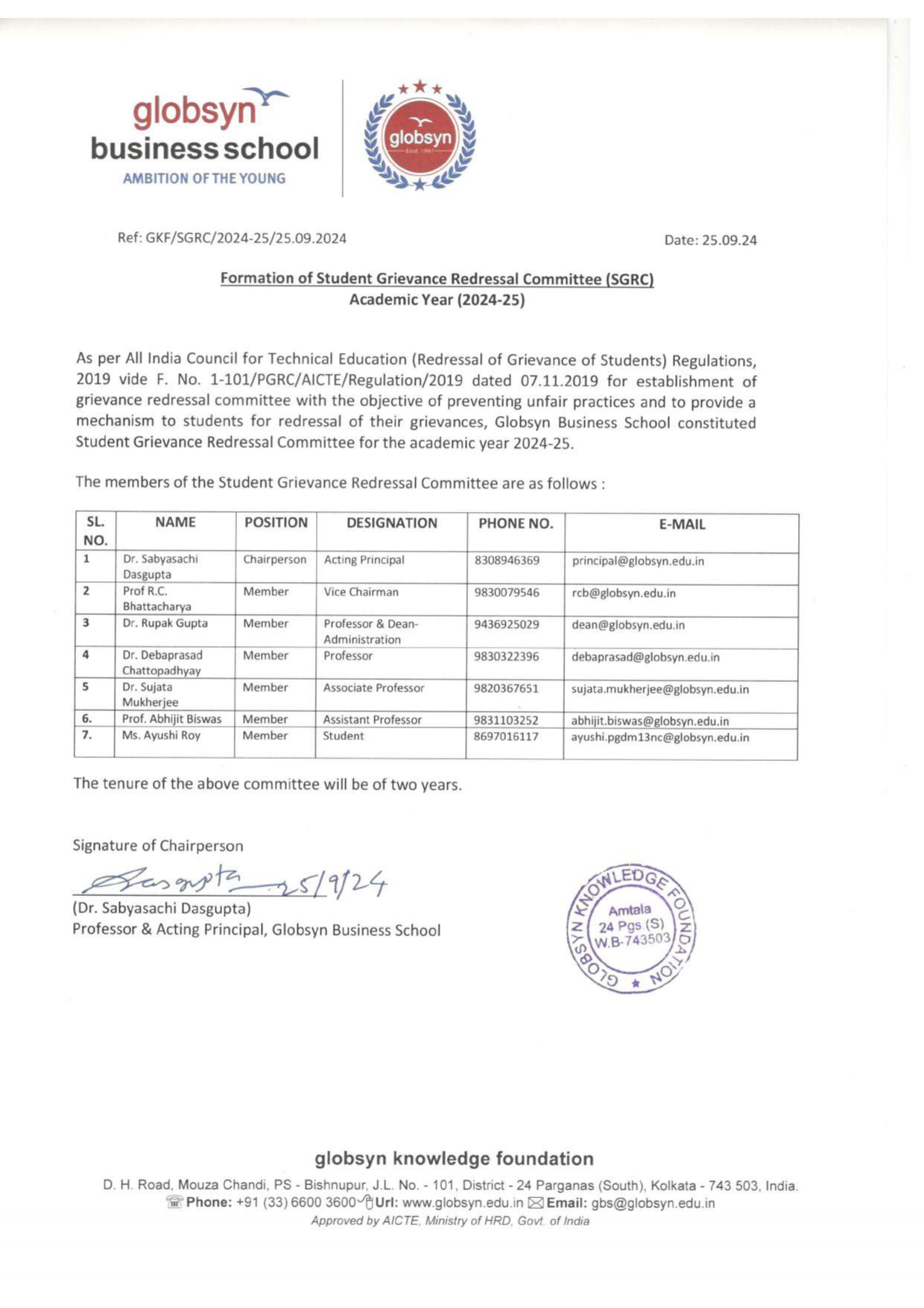 To know more about Globsyn Business School’s Students’ Grievance Redressal Committee, visit here.